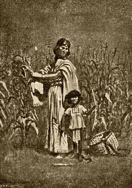 Мать, Голубое Перо, шла на работу, положив своего грудного ребенка в длинный коробок и подвесив его себе на спину. Из коробка торчала голова с двумя огромными круглыми черными глазенками. За матерью шла и дочь Белое Облако работать на кукурузном поле. Туда же собрались женщины и из других вигвамов. Работы было много, и к работе этой все относились с большим вниманием, все знали, что Мондамин – их спасение зимой.