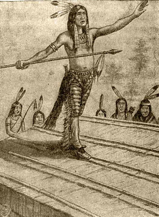 Когда индейцы собрались около своих вигвамов и начались игры, они не знают усталости, – целый день проходит в непрерывной смене игр. II мальчики и взрослые все вместе участвуют в общих играх или разделяются на группы и ведут каждый свою игру. В этих играх испытывается не только ловкость ног, быстрота движений, испытывается тут и меткость взгляда, сдержанность и хладнокровие.