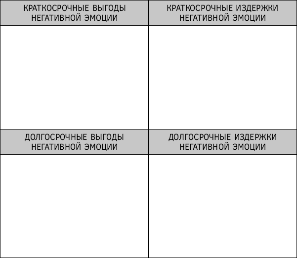 Также полезно выписать краткосрочные и долгосрочные выгоды (плюсы, преимущества, положительные последствия) и издержки (минусы, недостатки, отрицательные последствия) характерной для вас негативной эмоции, эмоций или стресса в целом (см. табл. 2).