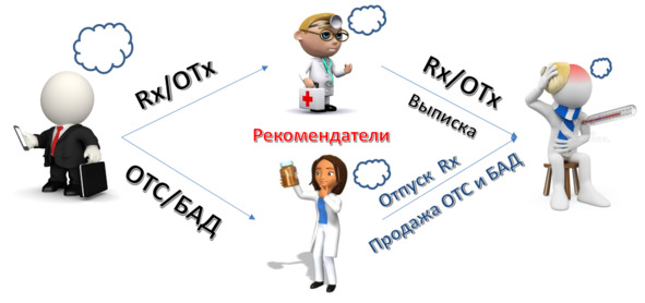 Суть схемы состоит в следующем: при продвижении рецептурных препаратов и препаратов группы ОТх (безрецептурных, но рекомендуемых врачами, например, большинства антигистаминных средств) представитель взаимодействует с врачом, а не с конкретным потребителем лекарства.