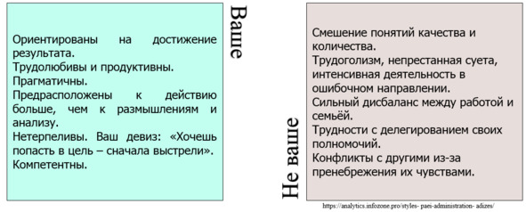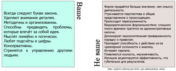 Теперь представьте себе классического администратора – таких среди менеджеров будет немало. Он знает правила работы, следует букве закона. Такой менеджер организован, методичен, мыслит логически. Любит анализировать цифры, стремится к управлению людьми. Из недостатков (если это можно так назвать) – консерватизм.