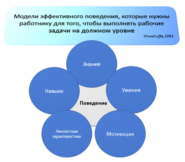 В 1992 году Woodruffe сформулировал одно из довольно удачных определений компетенции. Согласно его формулировке, «компетенции – это модели эффективного поведения, которые нужны работнику для того, чтобы выполнять рабочие задачи на должном уровне». А модели поведения не существуют сами по себе, а являются продуктом знаний человека, его умений, навыков, мотивации (!) и личностных характеристик.