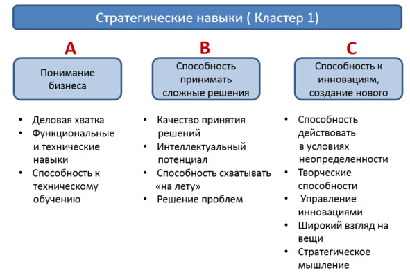 В каждом из кластеров содержится разное количество компетенций, они разбиты на подгруппы и описаны по основным признакам. Например, в первом кластере (стратегические навыки) в подгруппе А (понимание бизнеса) содержится 3 основных компетенции: «деловая хватка», «функциональные и технические навыки» и «способность к техническому обучению».
