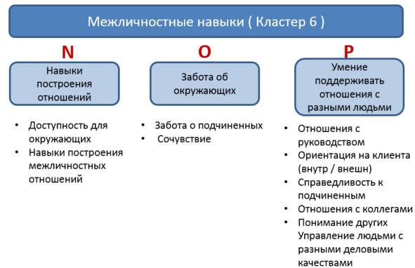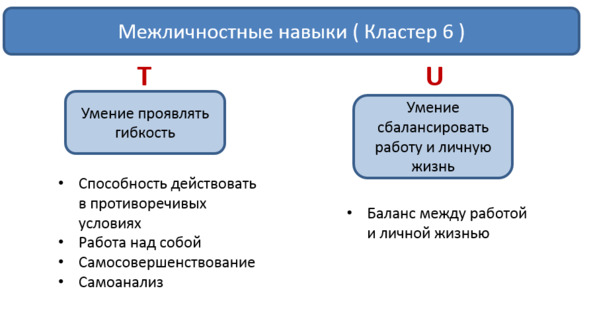 Модель состоит из описания 6-основных кластеров (групп) компетенций: