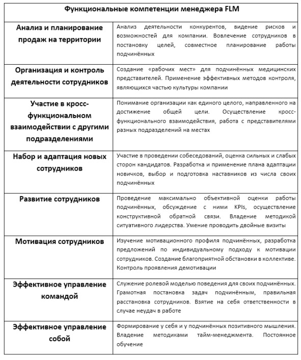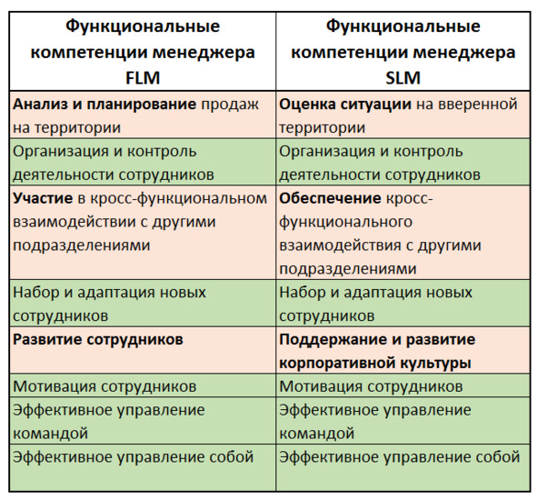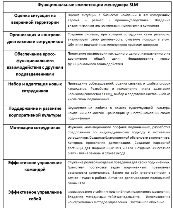 Как я уже говорил, базовые и лидерские компетенции у менеджеров FLM и SLM совпадают. Осталось привести только те функциональные компетенции, которыми должны обладать менеджеры для выполнения своих должностных обязанностей. Вот тут точно будут различия, и не только между уровнями менеджеров, но и между пониманием таких компетенций руководством разных компаний.