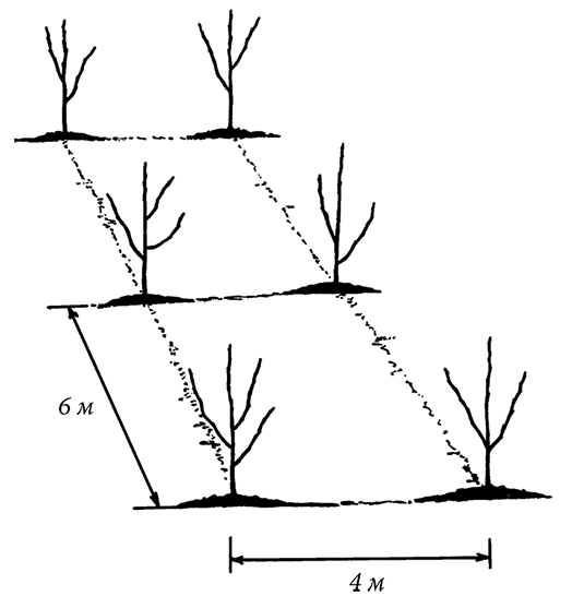 При посадке в несколько рядов яблони принято размещать на расстоянии 6 × 4 м друг от друга; при однорядной посадке расстояние между деревьями можно сократить до 3 м