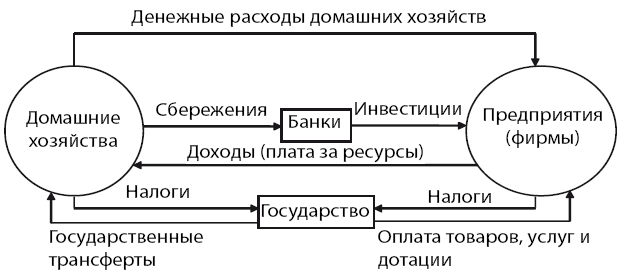Перераспределение сбережений и превращение их в инвестиции происходит при участии банков, играющих роль посредников. Государство собирает налоги с населения (домашних хозяйств) и предприятий, формируя тем самым доходную часть государственного бюджета. Расходные статьи государственного бюджета включают покупку товаров и услуг (для нужд обороны, строительства дорог, поддержки государственных предприятий и содержания учреждений и др.), выплаты домашним хозяйствам социальных трансфертов (субсидий, пособий, пенсий, стипендий).