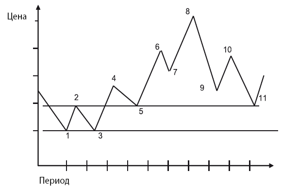 В точке 10 постепенно происходит смена мнения относительно направления тренда. Особо осторожные трейдеры начинают закрывать свои позиции с небольшим убытком, предполагая, что, возможно, происходит смена направления тренда. И здесь входят в игру трейдеры, играющие вниз, рассчитывая, что начался нисходящий тренд. Происходит резкое падение цены до точки 11. И т.д.