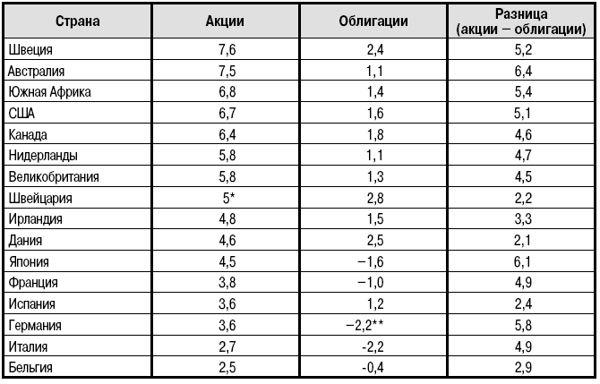 Реальная доходность акций и государственных облигаций: сравнение разных стран, 1900-2001 (%в год)