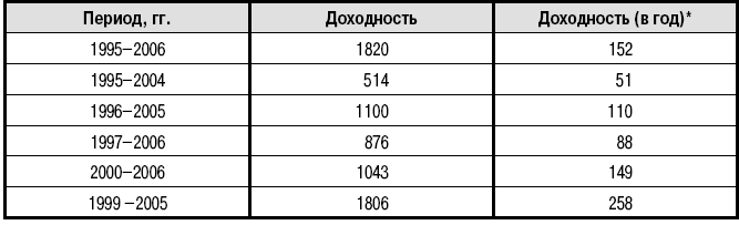 Аналогичный расчет можно сделать для рынка акций (табл. 7.4). Приведенные показатели вынуждают констатировать, что цикл благополучного периода роста стоимости российских акций является аномальным. В среднесрочном плане разница между доходностью по безрисковым и рисковым инструментам будет снижаться до среднерыночных показателей. Кроме того, с начала существования индекса РТС до настоящего времени (с учетом сложного процента) среднегодовая доходность составляет 34%; а за худший десятилетний период – 20%. Эти показатели необходимо скорректировать на индекс инфляции – 2,5% в год. Естественно, необходимо учитывать все особенности данного периода, начиная от изменения экономической системы и заканчивая существенной разницей в стоимости доллара по ППС (паритеу покупательной способности) и по его рыночному курсу.