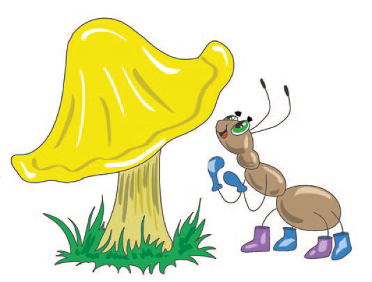 И вот однажды идет Муравьишка по лесу и видит: гриб растет красный, как солнышко. Остановился Муравьишка, полюбовался. Потом заметил Улитку, свой дом-ракушку несет, видно, переезжать собралась. Муравьишка за ней пошел, узнать, где она поселится. А вскоре приметил странного червячка. Он из-под упавшего сучка не может ногу вытащить, а их у него не счесть сколько: