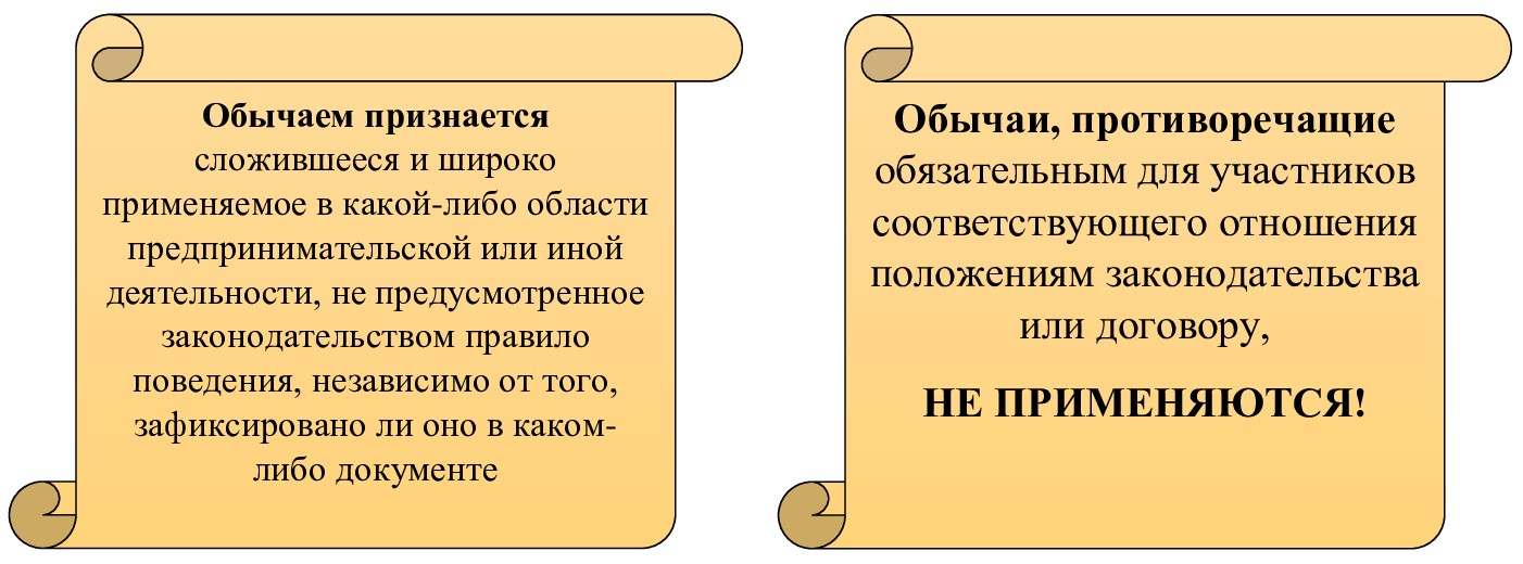 1. Обычаем признается сложившееся и широко применяемое в какой-либо области предпринимательской или иной деятельности, не предусмотренное законодательством правило поведения, независимо от того, зафиксировано ли оно в каком-либо документе.