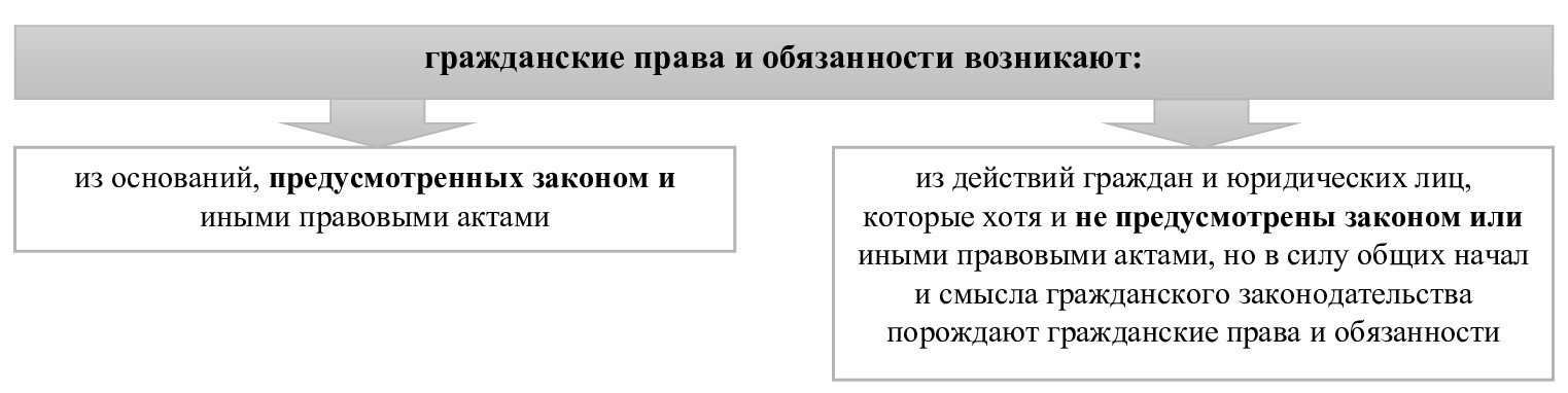 1. Гражданские права и обязанности возникают из оснований, предусмотренных законом и иными правовыми актами, а также из действий граждан и юридических лиц, которые хотя и не предусмотрены законом или такими актами, но в силу общих начал и смысла гражданского законодательства порождают гражданские права и обязанности.
