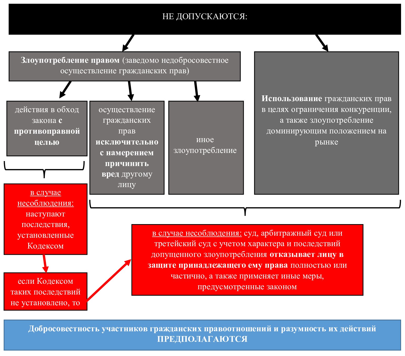 1. Не допускаются осуществление гражданских прав исключительно с намерением причинить вред другому лицу, действия в обход закона с противоправной целью, а также иное заведомо недобросовестное осуществление гражданских прав (злоупотребление правом).