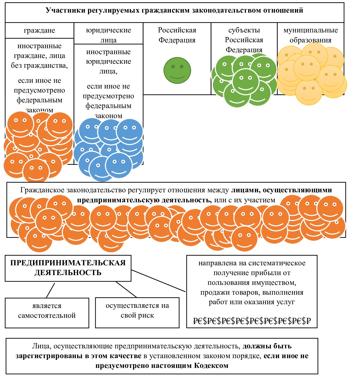 Гражданское законодательство регулирует отношения между лицами, осуществляющими предпринимательскую деятельность, или с их участием, исходя из того, что предпринимательской является самостоятельная, осуществляемая на свой риск деятельность, направленная на систематическое получение прибыли от пользования имуществом, продажи товаров, выполнения работ или оказания услуг. Лица, осуществляющие предпринимательскую деятельность, должны быть зарегистрированы в этом качестве в установленном законом порядке, если иное не предусмотрено настоящим Кодексом.