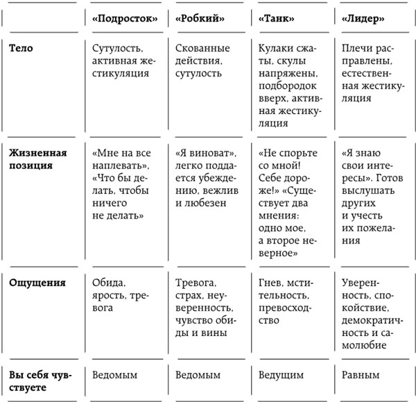 4. «Лидер». Практика показывает, что наилучших тактических и стратегических результатов достигают люди, которые умело сочетают заботу об оппоненте с уверенностью в отстаивании собственных интересов. Таким людям свойственно помнить о своих интересах, но не ущемлять других. В них сочетаются и корректность, и уверенность. «Лидер» не поддается давлению и, когда надо, сам оказывает его. Он слышит и понимает оппонента, адекватно оценивает ситуацию и управляет процессом переговоров. Человек, следующий данной модели, может быть и мягким, и жестким в зависимости от того, что целесообразно в настоящий момент. Он думает об оппоненте, о том, какое решение было бы выгодным для них обоих, и как повлиять на его поведение. Мягкий по форме и твердый по содержанию, как кулак в лайковой перчатке. Это и есть «положительный герой» – человек, на которого хочется быть похожим.