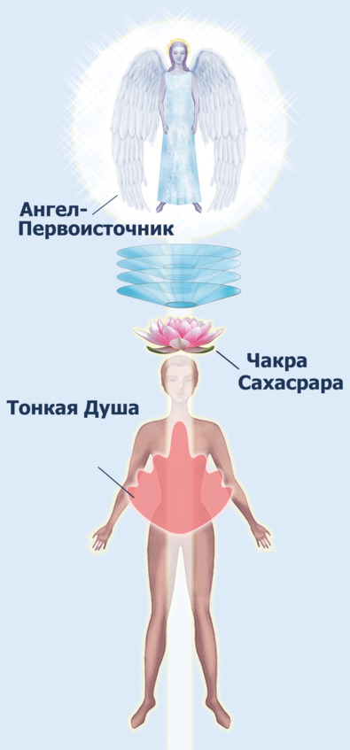 Применительно к Земным условиям, каждый человек, у которого Тонкая Душа находится в его теле, имеет связь через канал со своим Ангелом. Этот канал через центральные отверстия пронизывает все чакры человека. Ширина канала для разных людей разная, но, в среднем, она составляет от тридцати до шестидесяти сантиметров в диаметре. Проходя через все чакры и Тонкую Душу, расположенную между пуповиной и промежностью, этот канал организует протекание информатики между этими структурами, в том числе, поставляя информацию из пространства в тонкие тела. Эта энергия по своим качествам у каждого человека уникальна. Наш позвоночник, несмотря на все его изгибы, располагается ориентировочно в центре этого канала. С этим же каналом, точнее с его отсутствием или нарушением его структуры, что для человечества тоже естественно, связаны определённые болезни позвоночника и сколиозы. Конечно, это не является единственной причиной, но любая болезнь может иметь множество источников. Кроме того, разрушение или отсутствие такого канала может сказываться и на социальные или семейные отношения, вызывая значительные затруднения в поступлении светлых энергий через чакровый аппарат к физическому телу.