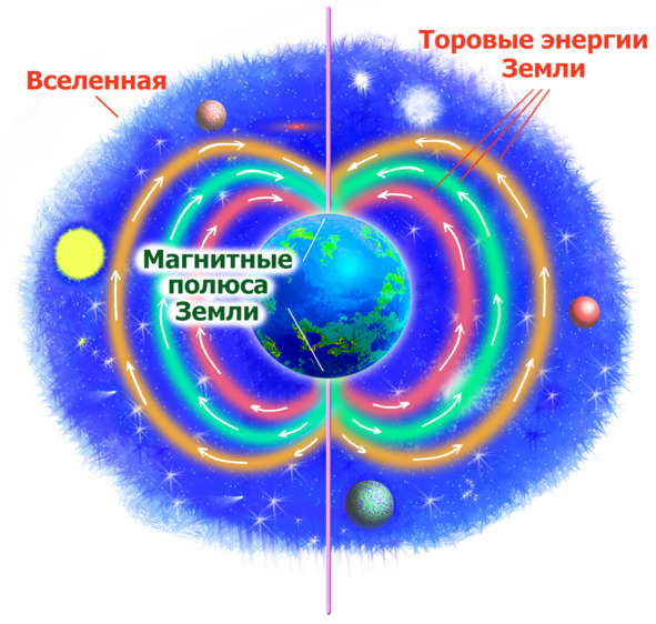 Теперь о механизме защиты Земли через торовые энергии. Суть его действия заключена в том, что устремляющиеся к Земле негативные энергии Вселенной и Мироздания, попадают в зону плотного интенсивного течения торовых энергий и начинают ими трансформироваться, так как имеют алгоритмы взаимодействия с энергиями окружающего пространства, направленные на безусловную трансформацию низковибрационных энергий соответствующих мерностей, попадающих в поле торовых энергий. Естественно, что в силу состояния Земли, далеко не все тёмные энергии проходят данный трансформационный процесс. В результате мы имеем ситуацию, связанную с образованием на Земле геопатогенных зон космического происхождения, возникающих в результате канального пробоя торовых энергий Земли энергиями тёмных высокоинтеллектуальных существ и образований космоса.