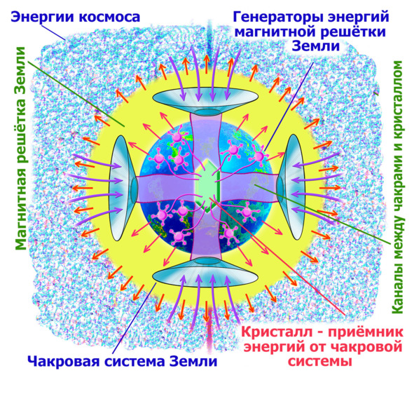 Итак, магнитная решётка Земли. Рассмотрим ориентировочную схему получения и трансформации Землёй энергий Творца. Это очень приблизительная структура, связывающая энергетику Космоса и энергии Гайи. Разумеется, она не содержит полноты информации и весьма схематична, но, тем не менее, рисунок, возможно, поможет понять некоторые механизмы взаимодействия Творца, Гайи и человека. Здесь очень хорошо видно, насколько схожи энергетическая структура Земли и человека. Попадая в чакры Земли, энергии расходятся в те, или иные её части, однако для образования магнитной решётки Земли используются самостоятельные чакры. Энергетическими каналами они связаны с центральным «кристаллом», который после соответствующей трансформации отправляет энергии к локальным генераторам энергий магнитной решётки, находящимся в толще Земли в определённых местах. Раскапывая землю найти их невозможно, потому что это невидимые многомерные энергетические образования, к тому же защищённые достаточно хорошо от любых возможных воздействий человека. Эти кристаллы и есть те самые управляемые трансформаторы энергий магнитной решётки Земли. Излучение этих кристаллов растекается по объёму Земли, охватывая всю Землю. Свойства магнитной решётки таковы, что её взаимосвязь с Землёй ослабевает по мере удаления от неё. Мы не будем углубляться в её свойства, тем более что вряд ли эта информация может быть расшифрована человеком, в том числе и автором. Это сокровенное творение Духа, и его тайна до поры не может быть разглашена. О них можно лишь сказать то, что это управляемые свыше генераторы, и их излучение создаёт решётку именно с теми свойствами, которые и отражают нынешнее общее вибрационное состояние Земли. Всё-таки, в магнитной решётке есть один уникальный момент, на котором хотелось бы остановиться подробнее. Этот момент связан со способностями человека «видеть» окружающий мир, в зависимости от настроек этой решётки. Постараемся пояснить данное высказывание. Несмотря на то, что таких генераторов не много, магнитная решётка формируется таким образом, что её настройки для каждого человека уникальны, и так же, как и в случае с Землёй, они соответствуют существующему интегрированному вибрационному состоянию его энергетического баланса. В балансе человека находится множество энергий, как светлых, так и тёмных древних. Интегрированная Высшими Силами совокупность этих вибраций и является тем ориентиром, по которому для каждого человека магнитная решётка настраивается персонально, она ведь тоже разумна. Таким образом, в конкретный момент времени, человеку доступны те, или иные энергетические возможности, связанные с этими настройками. Данные настройки имеют прямое отношение к ясновидению, как земных планов, так и космических, чувствительности к энергиям, и возможности работы с ними, целительным способностям. Механизм одновременно и сложен и прост, и работает ориентировочно следующим образом. Каждый человек имеет вестибулярный аппарат. Может показаться, что это обычный кусочек биологического тела, но у него достаточно широкие функции. Если задаться вопросом, почему человек может чувствовать энергии и определять их местоположение в земном пространстве, то можно понять, что задача определять положение в пространстве не только физического тела, но и определ