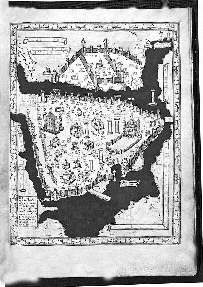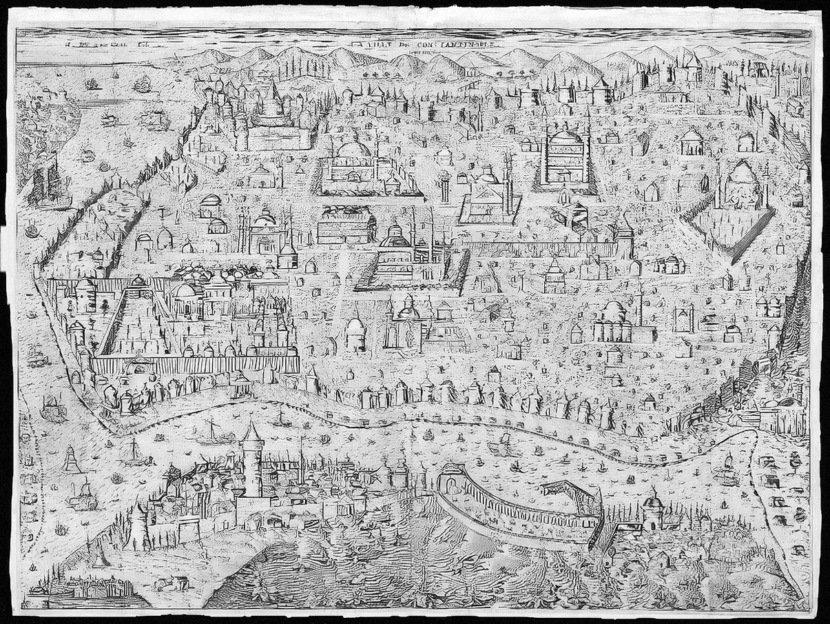 В современном городском ландшафте (в отличие от многих средневековых центров западноевропейских городов) византийские улицы едва проступают – редкое исключение составляет ведущая от Св. Софии далее на запад центральная улица Меса. Земельных кадастров от византийской эпохи не сохранилось, а немногие дошедшие до нас документы касательно собственности (в основном связанные с церковными учреждениями) тоже не особо помогают, так как описывают небольшие по площади и не известные из других источников участки[13]. Кадастры раннеосманского периода (второй половины XV века) лежат недоступные в архивах, а исследования других османских источников только начались, также из-за сложностей с их прочтением. Карт Константинополя в современном смысле практически не существовало, как и карт западных городов. Еще меньше информации дают миниатюры в рукописях (если за нарисованными «зданиями» вообще можно разглядеть облик Константинополя). Самые ранние изображения города созданы западными путешественниками: незадолго до 1420 года появился рисунок флорентийца Кристофоро Буондельмонти[14]; другой художник – Андреа Вавассоре (вторая половина XV века)[15], рисовал, возможно, по оригиналам Джентиле Беллини, который был в Константинополе в 1479 году; вероятно, самый точный вид города принадлежит датчанину Мельхиору Лорихсу (1557–1561 годы)[16]. Кроме того, существует и (частично) неизвестный османский иллюстративный материал – его топографическое и архитектурное изучение находится еще в самом начале.
