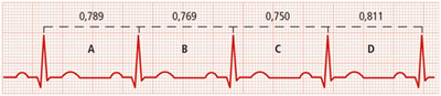 Würde das Herz also beispielsweise immer genau mit der Frequenz des Abschnitts A in der obigen Abbildung schlagen (= 0,789 Sekunden), so ergäbe das einen regelmäßigen Puls von 76 Schlägen / Minute. Die Frequenz des Abschnitts B (0,769 Sekunden) entspräche hingegen einem Puls von 78 Schlägen/Minute und so weiter: