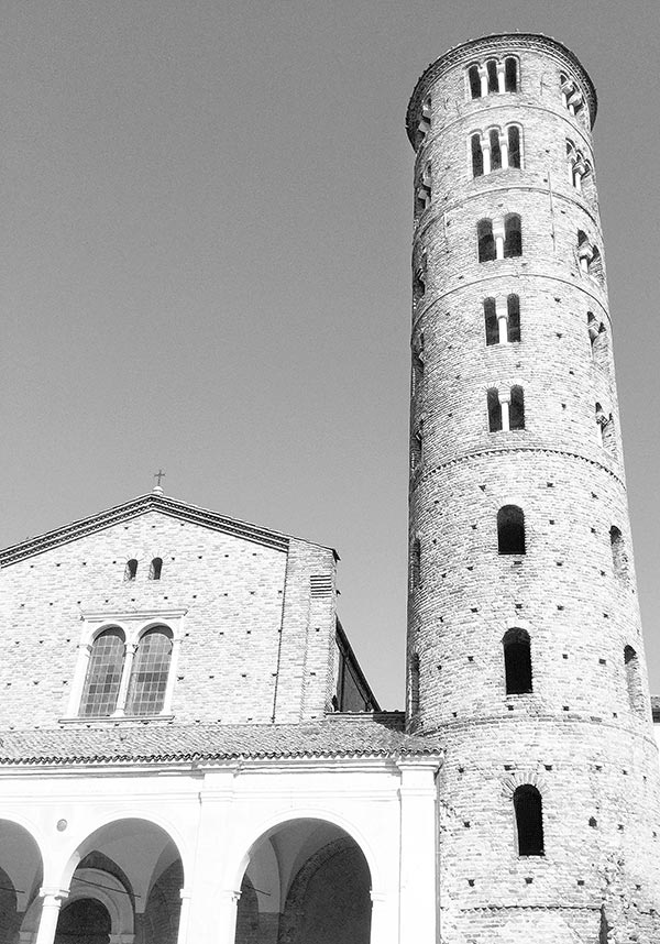 Бедность наружных стен здесь уже не повторяется: их красит глухая аркада; над капителью колонны помещается куб с трапециевидными сторонами, который облегчает переход от колонны к опирающейся в нее арке, почему арка не давит всей тяжестью на капители, и колонна кажется менее придавленной, с большей легкостью несущей тяжелый груз стены. Из равеннских церквей особенно замечательна церковь Святого Аполлинария, в которой нет обычных боковых крыльев. У Святого Аполлинария вместо этих крыльев есть вытянутое пространство, встречающееся в архитектуре впервые. Колонны расставлялись в Равенне несколько шире; и колонны, и детали начинают носить отпечаток какой-то новой, еще не ясной мысли. Некоторая пестрота выкупается прекрасным светом и величавостью общего.