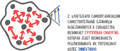 Но на этом все не заканчивается. Самоорганизация происходит не только на уровне взаимодействия единиц, но и при взаимодействии групп. Рано или поздно произойдет слияние и группы также объединятся в сообщество, позволяющее им лучше функционировать. И так далее, шаг за шагом. Самоорганизация происходит на всех уровнях от микромира до макромира. Атомы образуют молекулы, молекулы – клетки, клетки – организмы, организмы создают сообщества.