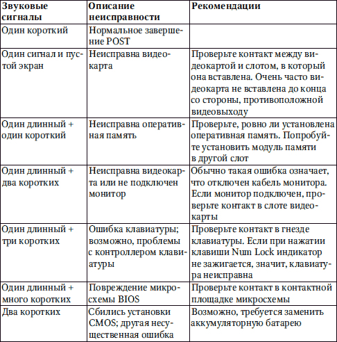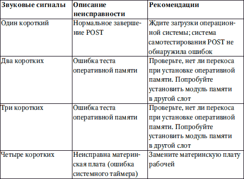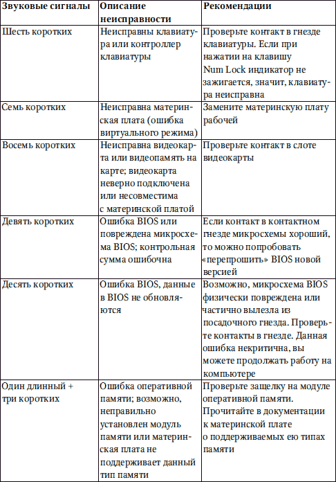 Если вы услышали последовательность коротких и длинных сигналов, обязательно посчитайте их количество и обратите внимание на длительность.[1] Подсчитав количество сигналов, найдите данное сочетание в таблице, соответствующей BIOS вашего компьютера, чтобы определить, что означает данный сигнал. В табл. 1.1–1.3 приведены основные варианты серий звуковых сигналов, характерные для BIOS разных производителей, а также краткие пояснения к ним.