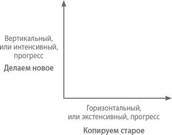 На макроуровне горизонтальный прогресс обозначается термином «глобализация» – процесс, при котором нечто работающее в одном месте планеты переносится в другие места и работает там. Китай – ярчайший пример глобализации: через 20 лет он планирует стать таким же, как современная Америка. Китайцы тщательно копируют все, что доказало свою работоспособность в развитых странах: железные дороги в XIX столетии, кондиционеры в XX веке. Копируют даже целые мегаполисы! На пути к прогрессу они могут перескочить через несколько ступеней – к примеру, переходя сразу на беспроводную связь, минуя этап строительства наземных линий связи. Но все равно речь идет лишь о воспроизведении имеющихся образцов.