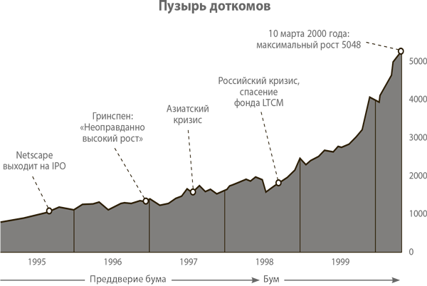 В декабре 1996 года, больше чем за три года до схлопывания пузыря, глава Федеральной резервной системы Алан Гринспен предупреждал, что «неоправданно высокий рост» может привести к «чрезмерному увеличению стоимости активов». Действительно, инвестиции в хай-тек текли полноводной рекой, но эти вливания имели вполне внятное объяснение. Слишком легко мы забываем о том, что в остальных областях экономики дела в то время шли отнюдь не блестяще. В июле 1997 года разразился восточноазиатский финансовый кризис. Капитализм, построенный на принципах кумовства, в сочетании с огромным внешним долгом привел экономики Таиланда, Индонезии и Северной Кореи на грань катастрофы. Затем, в августе 1998 года, последовал крах рубля, когда Россия, бившаяся в тисках хронического финансового дефицита, девальвировала собственную валюту, одновременно объявив дефолт по своим долговым обязательствам. Американских инвесторов изрядно встревожило появление на мировой арене страны с 10 тысячами ядерных боеголовок и без копейки денег на счетах: индекс Доу – Джонса за считаные дни рухнул более чем на 10 %. Надо сказать, беспокоились инвесторы не зря. Падение рубля вызвало мощную цепную реакцию, в результате которой рухнул хеджевый фонд LTCM, оперировавший значительными объемами заемных средств. Во второй половине 1998 года фонд ухитрился потерять 4,6 миллиарда долларов. У него оставалось еще порядка 100 миллиардов долларов долговых обязательств – но тут вмешалась Федеральная резервная система, предоставившая фонду мощную финансовую поддержку и мгновенно снизившая процентные ставки, чтобы избежать системного краха.