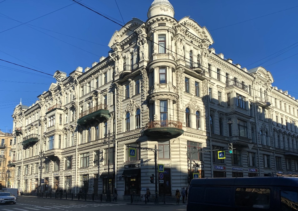 Расположимся возле дома 38 на перекрёстке с улицей Рылеева, откуда открывается великолепный вид на бывший доходный дом Акционерного Общества «Строитель» (Восстания, 51 / Рылеева, 20), построенный в 1913-1914 годах по проекту гражданского инженера Вацлава Иосифовича Кестнера.