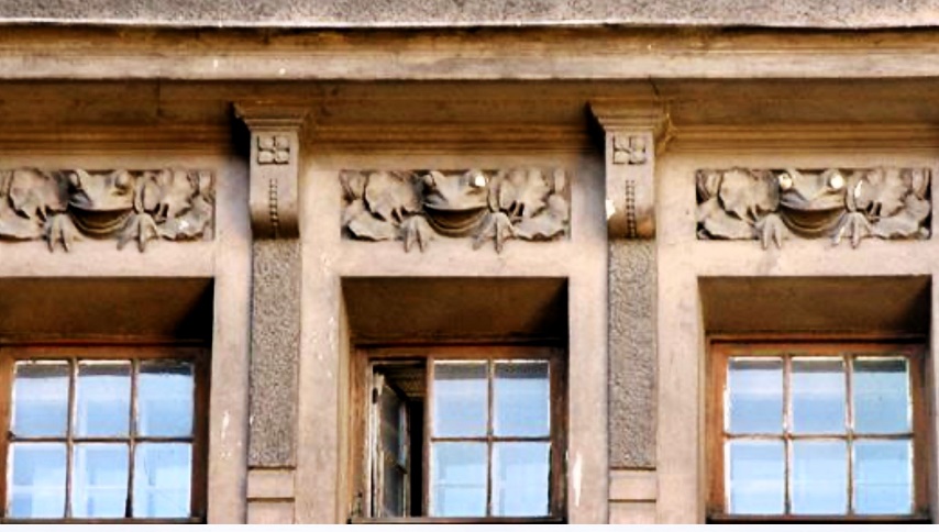 На подходе к улице Восстания оглянемся ещё раз и обнаружим, что перспективу Митавского переулка замыкает здание в стиле модерн (Митавский, 3) с эркерами разной формы. Цифры «1906» над одним из эркеров указывают год постройки. Нам видна только часть фасада доходного дома, созданного по проекту гражданского инженера Николая Давидовича Каценеленбогена на участке, расположенном на повороте Митавского переулка – если не самого узкого, то одного из самых узких в Санкт-Петербурге. Фасад украшают традиционные для «рационального модерна» майолики цвета морской волны и вставки светлой глазурованной плитки. Над окнами четвёртого этажа между эркерами Каценеленбоген поместил… лягушачьи головы. Рискну предположить, что это единственное изображение лягушки в качестве украшения в нашем городе.