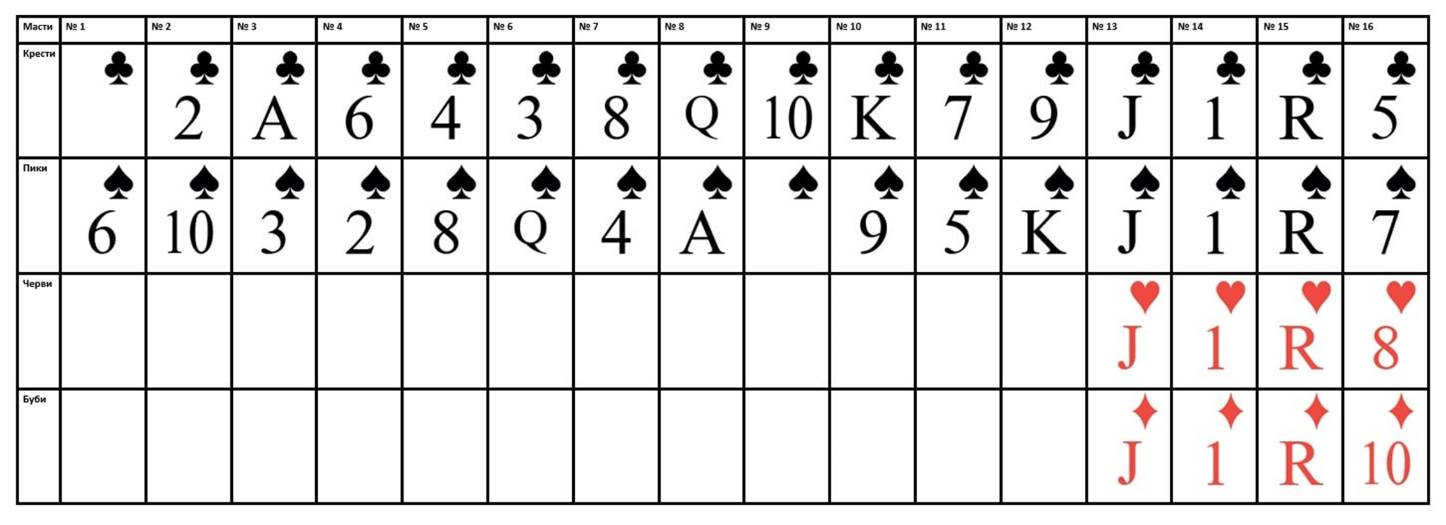 Не забывайте размещать карты по масти в нужных строках. Масть карт в строке определяется заранее, при выборе типа раскладки и указывается в левой части таблицы.
