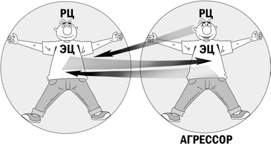 Рассмотрим схему речевого нападения подробнее. В конфликте задействованы два центра, отвечающие за развитие острой ситуации: уже рассмотренный нами эмоциональный центр (горло – грудная клетка – область живота) и рациональный центр (здравствуй, родной интеллект!).