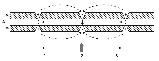 А – аксон нерва, М – миелиновая оболочка, 1 – скачкообразное (сальтаторное) распространение тока вперед к ближайшему перехвату Ранвье от деполяризованного участка, 2 – деполяризация мембраны аксона в зоне перехвата Ранвье при воздействии раздражения, 3 – скачкообразное (сальтаторное) распространение тока назад к предшествующему перехвату Ранвье от деполяризованного участка