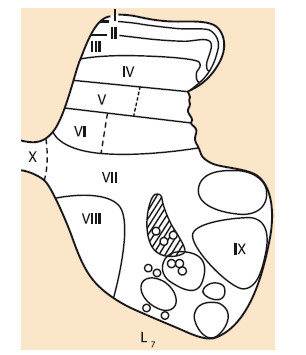 Пластины I–III, IV квалифицируются как первичная сенсорная область серого вещества, в нее проецируется большая часть афферентных волокон от туловища и конечностей.