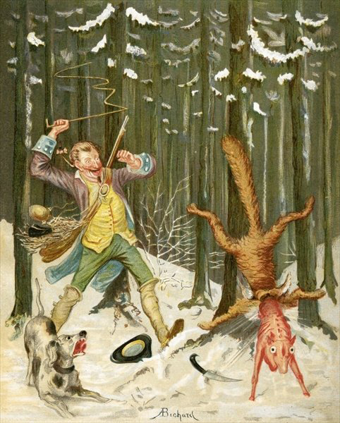«Ну, подожди, ты свое получишь!» – подумал я, поспешно зарядил ружье порохом, а сверху насыпал несколько вишневых косточек: я только что съел пригоршню вишен… Олень глядел на меня с самой язвительной усмешкой, и – «Бум!» – я влепил ему полный заряд в лоб, между рогами… Он пару раз тряхнул головой, поклонился, не спеша развернулся и, не теряя достоинства, удалился в глубь леса. Жаль, что у меня не было под рукой картечи!