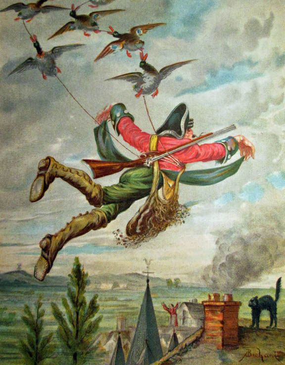 Очень обрадованный такой удачей, я обвил веревку с птицами вокруг пояса и отправился домой. Я шел и радовался столь редкой удаче, как вдруг почувствовал, что отрываюсь от земли. Представьте себе: утки, оправившись от первого испуга, замахали крыльями и подняли меня на воздух. Сначала это меня несколько ошеломило, но вскоре я опять овладел собой и стал грести полами кафтана прямо по направлению к моему дому. А когда мы пролетали над дымовой трубой, я, быстро оценив положение и свертывая уткам, одной за другой, головы, стал медленно снижаться, пока, наконец, не спустился, цел и невредим, не совсем обычной дорогой через трубу в кухонный очаг, – к величайшему изумлению повара, который собирался развести огонь, чтобы приготовить ужин.