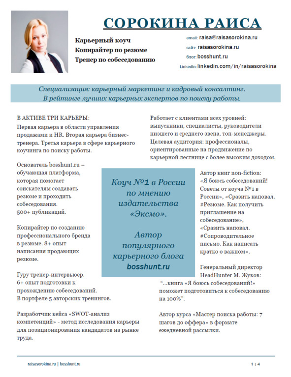 Сейчас Раиса входит в число лучших карьерных экспертов по поиску работы и является единственным в России копирайтером по созданию профессионального бренда в резюме.