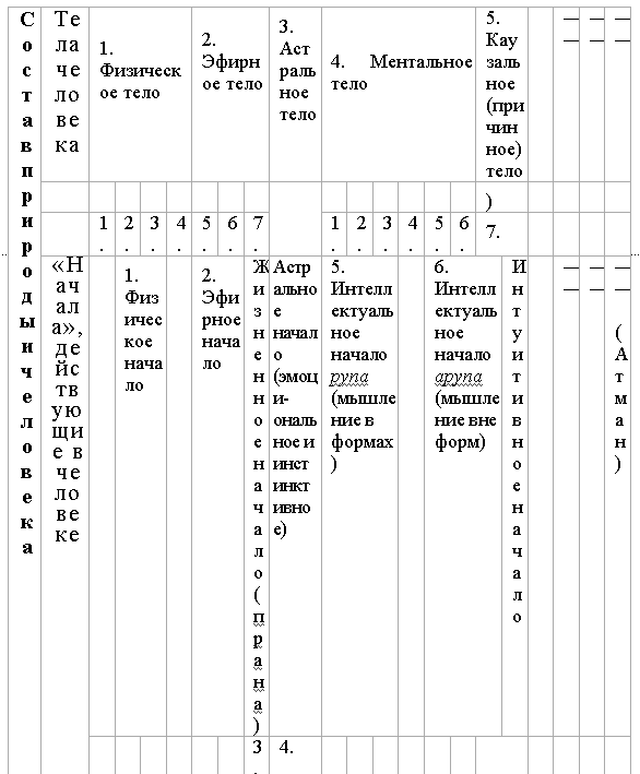 Взаимное отношение плоскостей, начал и тел согласно теософическому пониманию можно изобразить в следующей схеме (см. след. стр.).