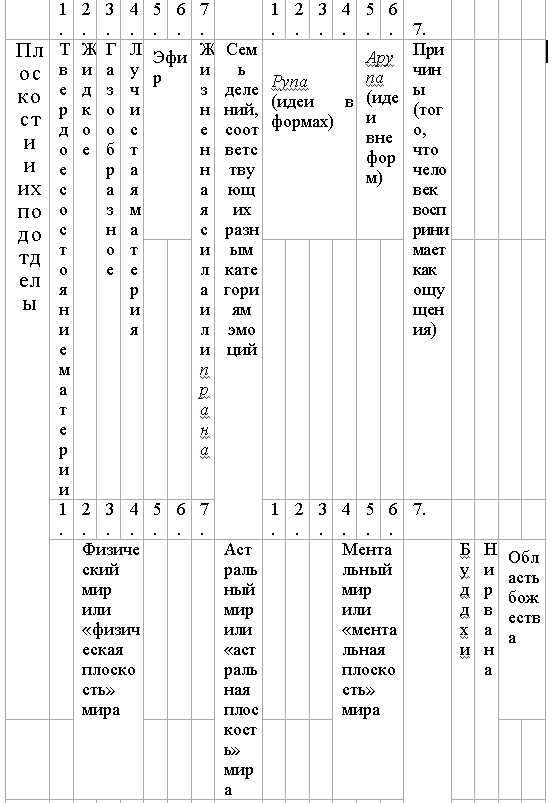Сознанию обыкновенного человека доступны только 3 первых плоскости: физическая, астральная и ментальная, на которых оно и действует. Каждая из этих трех плоскостей разделена на 7 подотделов. Таково деление природы.
