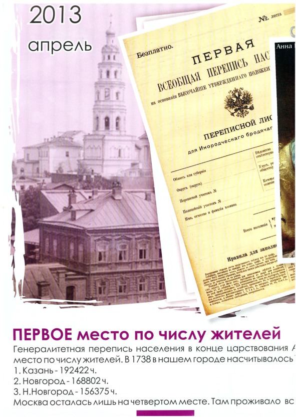 Генералитетная перепись населения в конце царствования Анны Иоановны показала места по числу жителей самых крупных городов того времени. Казань оказалась на первом месте по числу горожан – жителей города. В 1738 году в Казани насчитывалось 192422 человека. В первую тройку городов по численности вошли: