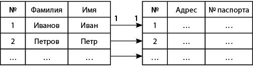 Отношение «один-к-одному» применяется тогда, когда стремятся сократить объем информации в одной таблице или защитить часть информации от доступа. Но здесь приходится выполнять больше операций чтения при извлечении связанных данных. В этом случае одной записи в главной таблице соответствует одна запись в подчиненной таблице (рис. 7).