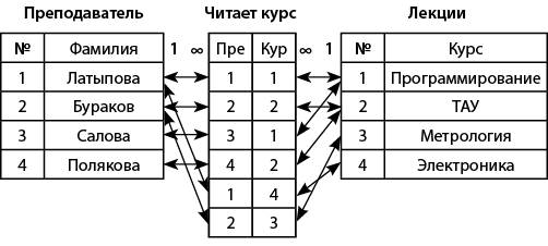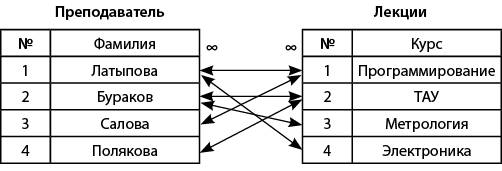 Любая связь «многие-ко-многим» может быть заменена на одну или более связей «один-ко-многим». Для этого нужно ввести промежуточную таблицу (рис. 9).