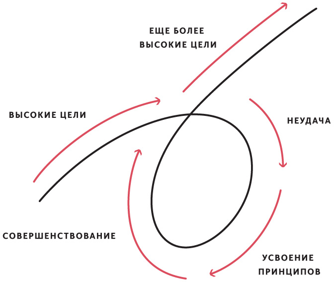 МОИ ПРИНЦИПЫ И ДОРОГА К НИМСвои принципы я формулировал на протяжении всей жизни, совершая множество ошибок и размышляя над ними. Я был любопытным ребенком, на все имел собственное мнение и ставил перед собой высокие цели. Мне нравилось визуализировать то, чего я хотел добиться. На пути к цели меня поджидали болезненные разочарования, благодаря которым я вывел принципы, позволившие мне избегать подобных ошибок в будущем. Я менялся, ставил перед собой еще более смелые цели, делал это быстро и часто на протяжении длительного времени. Жизнь для меня выглядела примерно как последовательность на рисунке ниже. Я был убежден, что ключ к успеху – это знание, как стремиться к большему и как достойно проигрывать. Под умением проигрывать я имею в виду способность усваивать уроки горьких неудач и оставаться при этом в игре.