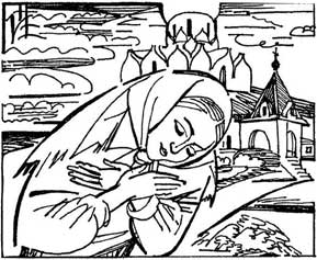 Поутру рассказала молодица свой сон соседке. Та быстро, точно сорока, тут же разнесла услышанное ею жителям крепости, и вскоре у дома вдовы собралась толпа мужиков и женщин. Стали они просить её отправить своего сына в подземелье. Долго не соглашалась вдова, но люди уговорили её. И она, взяв сына за руку, отправилась с ним на реку, ко входу в подземелье. Толпа в полной тишине шла за ними. Вот они с сыном подошли к проёму в песчаном обрыве, опустились на колени и долго молились. Затем вдова подвела сына к проходу и ласково сказала: «Алёша, сынок мой, на тебя одна наша надежда, только ты сможешь спасти всех нас от нечистой силы, только ты сможешь победить злую колдунью. Иди, да поможет тебе Бог наш, Иисус Христос».