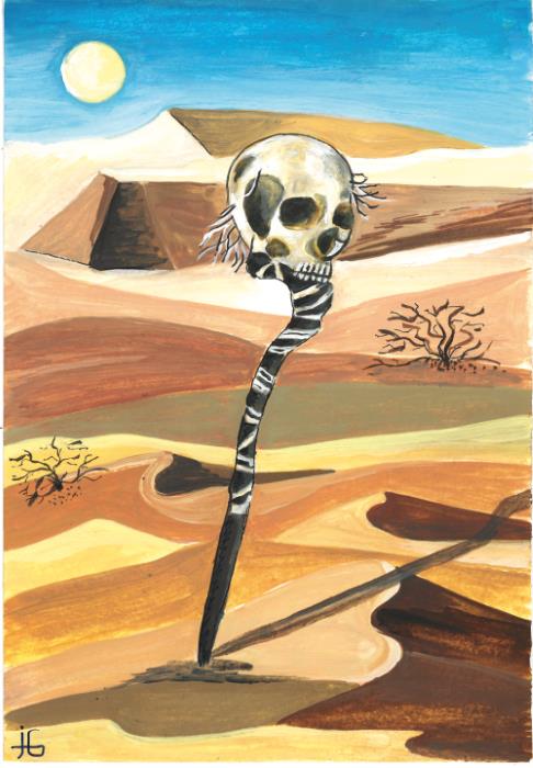 Передо мной возвышалась сучковатая палка с надетым на навершие черепом… М-да… Долгие поиски в архивах и библиотеках, утомительный разбор зашифрованного текста. Потом путешествие с материка на материк, долгие переговоры с племенем хашимитов, пока они не согласились дать мне проводника. Тяжёлый двухнедельный путь