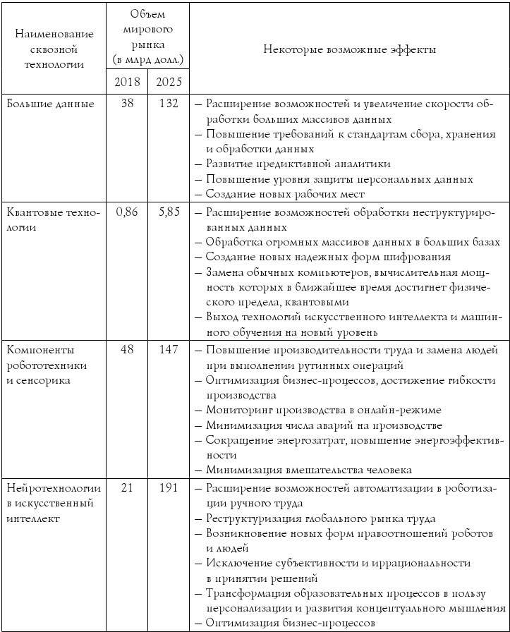 Следует отметить, что описание содержания, значимости и возможного эффекта от применения новых сквозных технологий приводится сегодня во многих научных работах и докладах российских и зарубежных авторов, посвященных цифровой экономике. Многие из этих технологий будут рассмотрены в следующих главах. Приведем здесь лишь возможные оценки эффектов и потенциальные объемы новых рынков, которые будут формировать эти технологии уже через 5–7 лет (см. табл. 1.2). Они не могут не впечатлять.