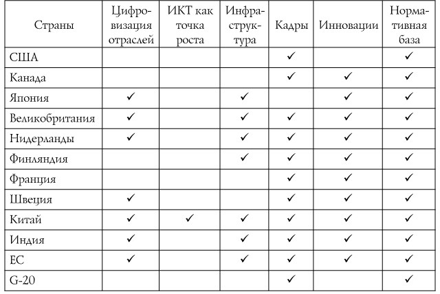 Таблица 1.6. Основной фокус разрабатываемых стратегий и программ в области цифровых технологий в развитых странах мира