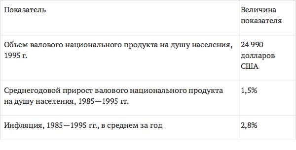 К сожалению, реализация политики дерегулирования в стране привела к тому, что начали снижаться среднегодовые темпы экономического роста. В 1980–1990 гг. прирост валового внутреннего продукта в среднем за год составлял 3,2 %, а в период 1990–1995 гг. он уже сократился до 1,4 % в год. Среднегодовые темпы прироста дефлятора ВВП также сократились с 5,7 % в среднем за 1980–1990 гг. до 3,6 % в среднем за 1990–1995 гг.